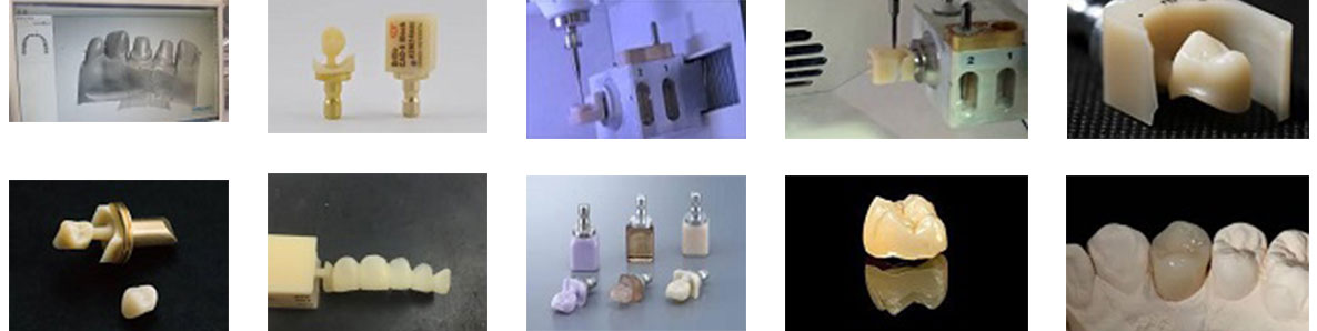 ハイブリッドレジンを始め、ジルコニア、PMMA、ワックスを高精度に削り出しを行います。 審美性に優れた付加価値の高いクラウン・ブリッジの製造が可能となりました。当技巧所ではブロックとしてデンケンハイデンタル社のBrillo CAD-S Blockを使用しています。又、同時4軸制御を備えているほか、ATC(自動刃物交換装置)を標準で搭載しており、荒削りと仕上げまでの高度な加工をフルオートで効率的にこなします。