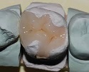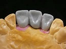 歯科医院からの印象から、石膏模型を作成し半調節咬合機により咬合器装着後、WAXUPから窓開け埋没・鋳造を行い、ディキャッシング時はアルミナによる金属表面処理を行います。